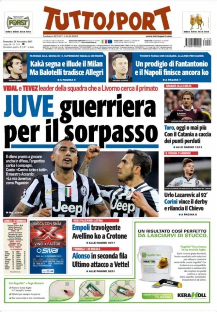 RASSEGNA STAMPA TUTTOSPORT – Vidal e Tevez leader di una squadra che a Livorno cerca il sorpasso. Il cileno pronto a giocare in difesa, l’argentino carica i compagni. Conte: “Contro tutto e tutti”. Il maestro Accardo: “La mia Juventus come Paganini”. Kakà segna e illude il Milan ma Balotelli tradisce Allegri. Un prodigio di Fantantonio e il Napoli finisce ancora ko.