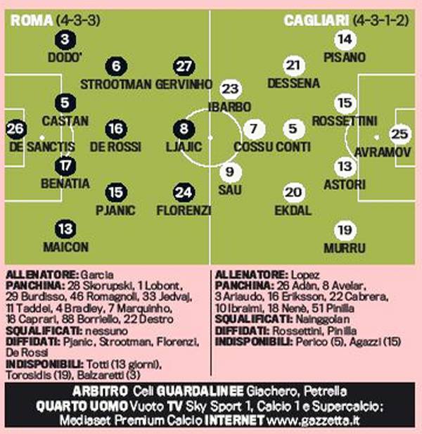 ROMA CAGLIARI PROBABILI FORMAZIONI GARCIA GERVINHO IBARBO – Questa sera la Roma di Rudi Garcia cercherà in tutti i modi di vincere contro il Cagliari e riportarsi in vetta alla classifica visto che la Juventus ieri con la vittoria sul Livorno è balzata in avanti. Rudi Garcia, tecnico della Roma, recupera Gervinho, attaccante ivoriano, vera e propria freccia nell’arco della rosa giallorossa. Il tridente sarà formato dall’ivoriano, Florenzi e Ljajic. Centrocampo titolare con Strootman, De Rossi, Pjanic, in difesa spazio a Dodò al posto di Balzaretti. Nel Cagliari invece duo d’attacco molto veloce, ovvero Ibarbo e Sau con Cossu dietro di loro. Ecco le probabili formazioni secondo la Gazzetta dello Sport.