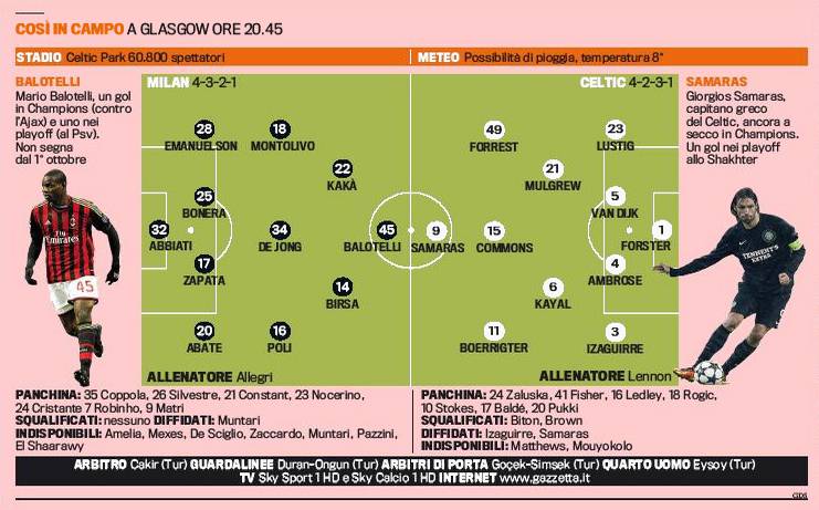 CELTIC MILAN PROBABILI FORMAZIONI ALLEGRI BIRSA POLI SAMARAS – Questa sera il Milan giocherà in Scozia contro il Celtic e cercherà punti qualificazione. Ai rossoneri potrebbe bastare anche un pareggio ma vista l’attuale situazione dei rossoneri sarebbe meglio una vittoria per rasserenare l’ambiente. Allegri ha avuto dei dubbi di formazione, ma avrebbe già sciolto tutte le riserve. In difesa accanto a Zapata giocherà Bonera, con Abate ed Emanuelson sulle fasce. Poli completerà il tridente di centrocampo con De Jong e Montolivo, mentre Kakà e Birsa giocheranno alle spalle di Balotelli. Nel Celtic occhio al pericolo numero uno, ovvero Samaras. Le probabili formazioni secondo la Gazzetta dello Sport.