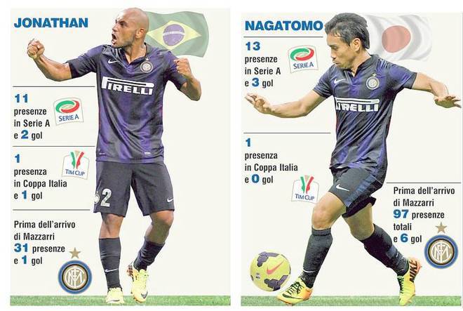 FOTO INTER MAZZARRI JONATHAN NAGATOMO – A detta di tutti, uno dei maggiori meriti di Walter Mazzarri, tecnico dell‘Inter arrivato in estate, è stato certamente quello di aver rivalutato un parco giocatori che dopo la terrificante stagione vissuta con Stramaccioni in panchina, pareva tutto da cestinare. Ad aver migliorato notevolmente il proprio rendimento rispetto alla disgraziata annata del 9° posto sono certamente i terzini nerazzurri, Jonathan e Nagatomo, trasformatisi da brutti anatroccoli a splendidi cigni delle fasce. E le statistiche dei due calciatori non mentono, come rivela questa grafica di Tuttosport che potete trovare qui in alto.