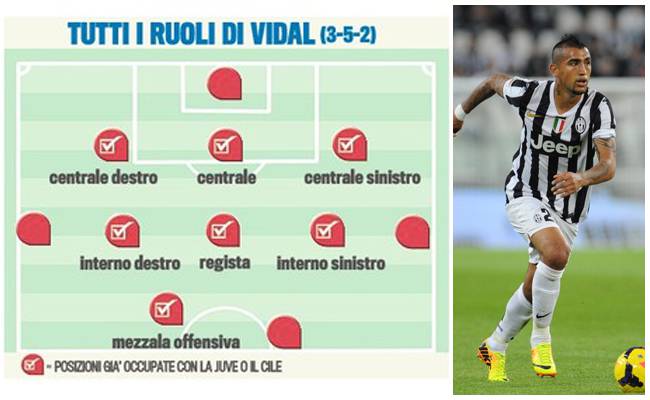 FOTO JUVENTUS VIDAL – Facciamo un piccolo gioco: pensate ad un calciatore che, secondo voi, più di tutti ha influito nelle ultime 3 Juventus allenate da Antonio Conte. Quasi tutti, ne siamo certi, insieme ad Andrea Pirlo, indicherete Arturo Vidal, calciatore cileno arrivato quasi in sordina nell’estate 2011 dal Bayer Leverkusen. Carattere invidiabile, grande lucidità ed una dedizione al sacrificio senza pari contraddistinguono il cileno numero 23 della Juventus, tramutatosi in pochi anni in una vera e propria colonna portante del progetto Juventus. Senza dimenticare, ovviamente, la grande duttilità mostrata da Vidal negli ultimi anni. Centrocampista centrale, regista, trequartista o addirittura difensore centrale, per Vidal non fa differenza, l’importante è scendere in campo con la solita verve. I tifosi bianconeri questo lo sanno e lo sa pure bene la dirigenza bianconera, pronta a ricoprire d’oro il sudamericano con un nuovo contratto.