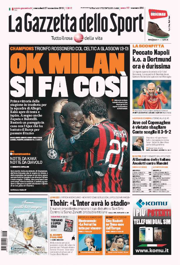 GAZZETTA MILAN – La gazzetta dello Sport elogia il Milan che vince tre a zero a Glasgow contro il Celtic in Champions League.