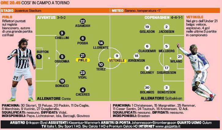 JUVENTUS COPENHAGEN PROBABILI FORMAZIONI OGBONNA TALENTO – Vincere o complicarsi maledettamente la vita in Champions League. La Juventus di Antonio Conte questa sera in casa vuole assolutamente vincere contro il Copenhagen per aumentare le proprie chances di qualificazione agli ottavi della massima competizione europea. Nella Juventus giocherà Ogbonna al posto di Barzagli, mentre a centrocampo Pirlo orchestrerà la manovra dei bianconeri. In attacco confermata la grande coppia Llorente-Tevez. Confermato a destra l’impiego di Caceres che ha fatto molto bene a Livorno. Nel Copenhagen occhio al giovane e veloce talento belga Vetokele, under 21, che è in ottime condizioni. Le probabili formazioni secondo la Gazzetta dello Sport.