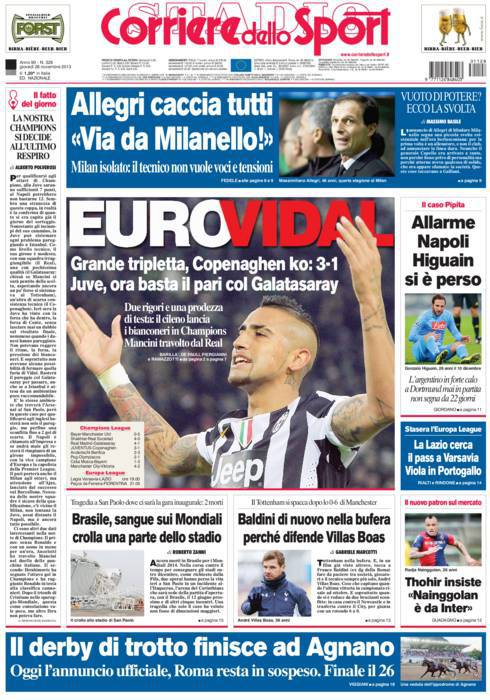 CORRIERE VIDAL – Tre gol di Vidal stendono il Copenhagen, la Juventus ora può qualificarsi agli ottavi, basterà un pareggio contro il Galatasaray.