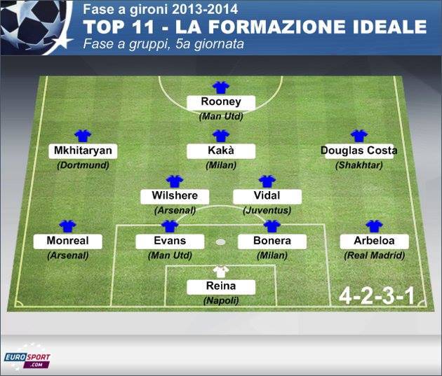 TOP 11 CHAMPIONS LEAGUE – La due giorni di Champions League ha regalato grandi emozioni e tanti gol sia per le squadre italiane che per le straniere. Juventus e Milan possono sorridere mentre lo stesso non può fare il Napoli, battuto dal Borussia. Tuttavia, nonostante la sconfitta, nella top 11 della Champions League, è presente anche il Napoli. Nella formazione schierata con il 4-2-3-1, infatti, in porta troviamo Reina, in difesa Arbeloa, Bonera, Evans e Monreal. A centrocampo abbiamo Wilshere e Vidal mentre sulla trequarti troviamo Douglas Costa, Kakà e Mkhitaryan. In attacco, invece, come unica punta, abbiamo Rooney.