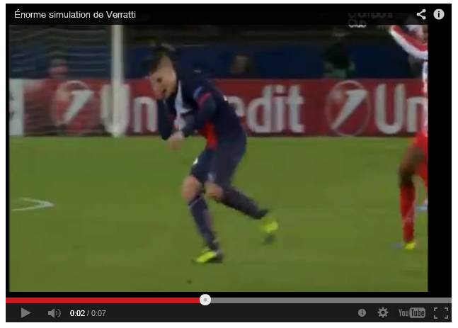 VIDEO SIMULAZIONE VERRATTI – Per il Psg, battuto dall’Olympiacos per 2-1 ma soprattutto per Marco Verrati, è stata una notte da dimenticare. Il centrocampista italiano, infatti, è stato espulso per doppia simulazione e il primo cartellino giallo dà un’immagine molto negativa del talento del Psg. Verratti, infatti, nel tentativo di bloccare un passaggio in mezzo al campo, colpisce il pallone con un braccio. Per evitare il cartellino giallo, però, Verratti cerca di far credere all’arbitro Craig Thomson di essere stato colpito al volto. Purtroppo per lui, però, l’arbitro non ci casca e scatta l’ammonizione. Un episodio che non fa molto onore al giovane centrocampista.