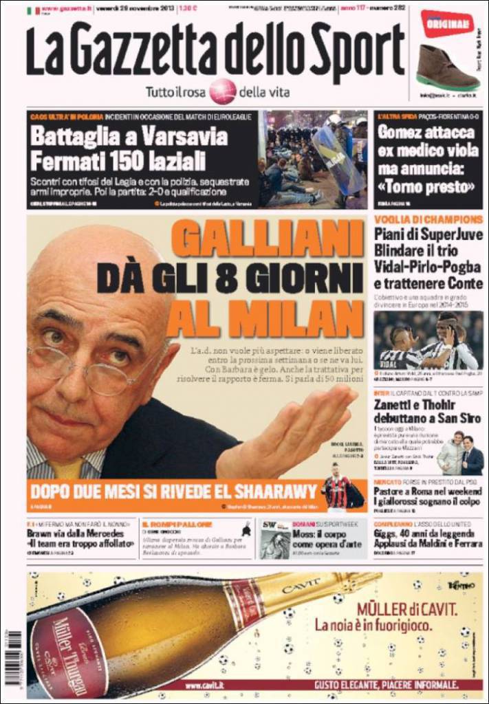 RASSEGNA STAMPA GAZZETTA DELLO SPORT – Adriano Galliani non vuole più aspettare: o viene liberato entro la prossima settimana o se ne va lui. Con Barbara Berlusconi è gelo. Anche la trattativa per risolvere il rapporto è ferma. Si parla di 50 milioni. Battaglia a Varsavia: fermati 150 laziali. Gomez attacca ex medico viola ma annuncia: “Torno presto”. Piani di super Juve: blindare Vidal-Pirlo-Pogba e trattenere Conte. Zanetti e Thohir debuttano a San Siro. Pastore a Roma nel weekend: i giallorossi sognano il colpo.
