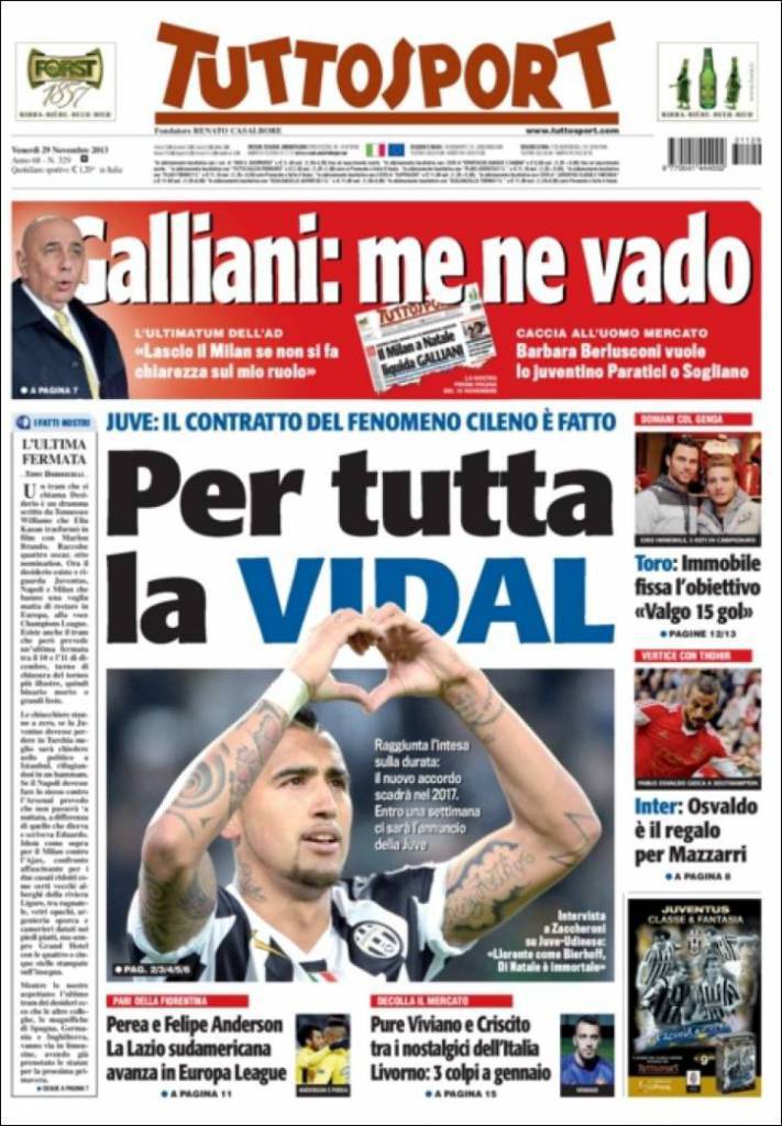 RASSEGNA STAMPA VIDAL – Raggiunta l’intesa sul rinnovo di contratto tra la Juventus e il cileno: il nuovo accordo scadrà nel 2017. Entro una settimana ci sarà l’annuncio della Juve. Galliani: me ne vado. L’ultimatum dell’ad: “Lascio il Milan se non si fa chiarezza sul mio ruolo”. Barbara Berlusconi vuole lo juventino Paratici o Sogliano. Inter: Osvaldo è il regalo per Mazzarri.
