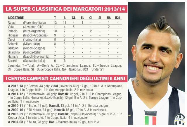 LA SUPER CLASSIFICA DEI MARCATORI 2013/14 – La stagione 2013/2014 è iniziata nel segno del gol e dei centrocampisti. Sono tantissimi, infatti, i marcatori in classifica che continuano a segnare gol pur non essendo dei bomber nati. Al primo posto di questa speciale classifica, però, troviamo un grande attaccante che dopo due anni di purgatorio ha recuperato la classe e la forza di un tempo e cioè Pepito Rossi che con la maglia della Fiorentina ha già segnato 12 gol di cui 11 in serie a e 1 in Europa League ed è tornato al gol anche con la maglia della Nazionale. Al secondo posto, invece, troviamo l’eroe dello Juventus Stadium, Arturo Vidal che ha messo la sua firma 9 gol bianconeri di cui 4 in serie A e 5 in Champions. Tra gli altri nomi troviamo poi Palacio, Higuain, Cerci, Balotelli, Callejon, Gilardino, Hamsik e Berardi.
