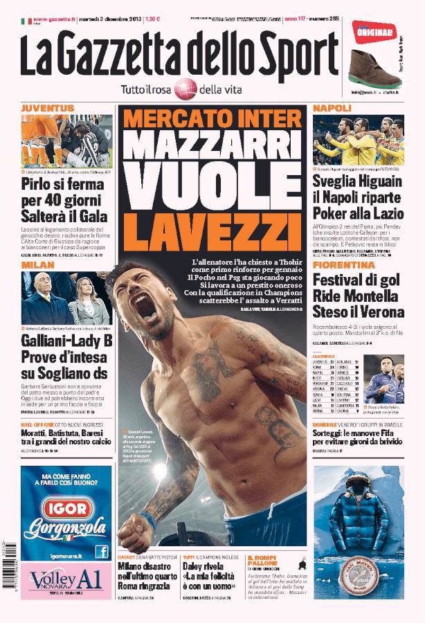 GAZZETTA LAVEZZI – Mazzarri, tecnico dell’Inter, ha chiesto a Thohir l’acquisto di Lavezzi dal Psg.