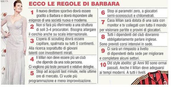 MILAN BARBARA BERLUSCONI MERCATO NOVITA’ DECALOGO – Ci saranno nuove regole nel Milan soprattutto per quanto riguarda dirigenza e mercato, come rivelato dalla Gazzetta dello Sport. Un decalogo di 10 punti che Barbara Berlusconi vuole far rispettare a tutti. In primis la scelta del direttore sportivo che dovrà essere gradito dalla figlia del presidente. Basta lavorare con i soliti quattro procuratori, il cerchio dovrà essere allargato, niente colpi last minute o parametri zero o giocatori sconosciuti. Ci sarà maggiore attenzione per quanto riguarda i giovani talenti, verranno visionati tanti giocatori e ci sarà una grande opera di scouting. Barbara Berlusconi vuole rinnovare il Milan soprattutto da questo punto di vista.