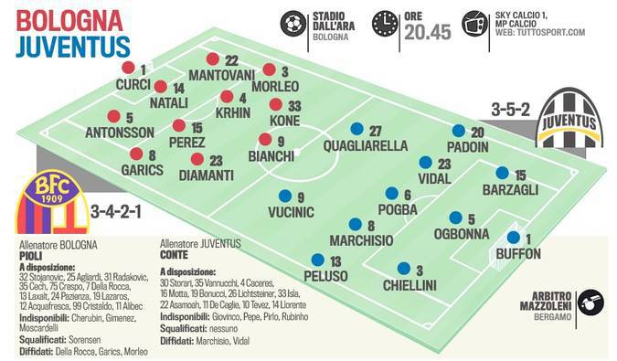 BOLOGNA JUVENTUS PROBABILI FORMAZIONI QUAGLIARELLA TEVEZ PIOLI BIANCHI FOTO – Questa sera allo stadio Dall’Ara anticipo di campionato tra Bologna e Juventus. I bianconeri vogliono vincere per volare a più sei dalla Roma e mettere pressione ai bianconeri. Conte ha deciso di usare un turnover ragionato, in difesa ci sarà Ogbonna al posto di Bonucci mentre gli esterni di centrocampo saranno Padoin a destra e Peluso a sinistra. Il sostituto di Pirlo sarà Pogba, con Vidal e Marchisio accanto. In attacco la novità più grande, Conte cambia la coppia d’attacco, dentro Quagliarella-Vucinic al posto dei titolari Llorente-Tevez. Nel Bologna invece ci sarà Bianchi. Ecco le formazioni di Tuttosport.