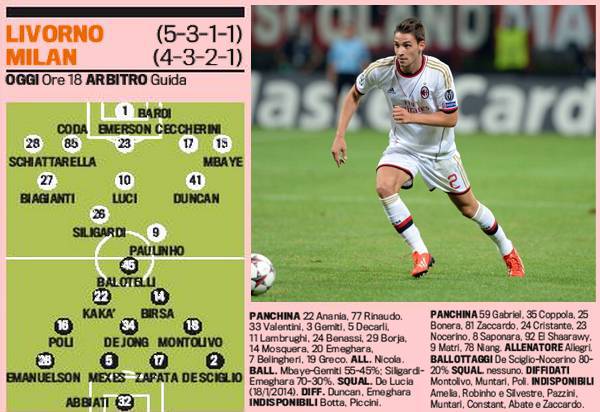 LIVORNO MILAN PROBABILI FORMAZIONI DE SCIGLIO – Riuscire a lasciare Livorno con 3 punti in cascina potrebbe essere un gran toccasana per il Milan di Massimiliano Allegri, alla ricerca di conferme dopo la bella vittoria di Catania. Per riuscire a battere i labronici, pronti a lottare strenuamente per la salvezza, serviranno però grandi individualità e soprattutto il gioco corale che in poche occasioni i rossoneri hanno sfoderato. Liete notizie dall’infermeria meneghina: si rivede De Sciglio, convocato ed arruolabile forse già dal primo minuto. In casa amaranto si spera invece in Paulinho, a secco da settimane. Il bomber brasiliano spera di trovarsi nel tabellino dei marcatori al termine della gara: ci riuscirà?