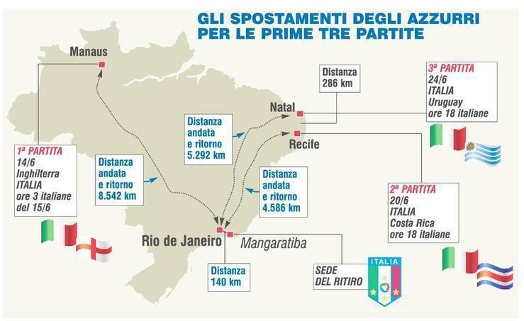 MONDIALI 2014 ITALIA SPOSTAMENTI- Quello dell’Italia è probabilmente il girone più difficile del mondiale 2014. Non solo per le avversarie (anche se Inghilterra, Uruguay, Costa Rica), ma, soprattutto, per gli spostamenti: il mondiale degli azzurri comincerà alle 3 di notte del 15 giugno contro l’Inghilterra a Manaus, distante ben 8.542 chilometri (fra andata e ritorno) dalla sede del ritiro della squadra di Prandelli. La seconda gara si giocherà il 20 giugno alle 18 italiane a Recife (distante 4.586 chilometri dalla sede del ritiro) contro il Costa Rica, mentre la terza gara si giocherà a Natal (a oltre 5 mila chilometri fra andata e ritorno) il 24 giugno contro l’Uruguay. Insomma spostamenti su spostamenti, per arrivare primi nel girone.