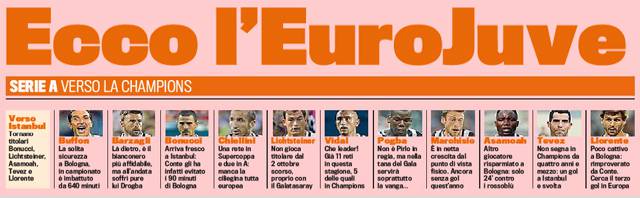 JUVENTUS GALATASARAY – Dopo la vittoria sul Bologna, la Juventus si rituffa in clima Champions dove, contro il Galatasaray sarà fondamentale prendere almeno un pareggio. Antonio Conte sembra avere le idee chiare e senza Andrea Pirlo che tornerà solo nel 2014, ha già scelto gli undici leoni che scenderanno nell’arena della Turchia. Partendo dalla difesa, per la Juventus che finora ha sempre preso gol in Champions, sarebbe meglio evitarlo. I difensori bianconeri, però, arrivano alla grande sfida in perfette condizioni fisiche. Barzagli è una garanzia, Chiellini, a Bologna, ha dimostrato di stare bene mentre Buffon sta tornando ai suoi livelli. A centrocampo, senza Pirlo, ci saranno Marchisio che dopo aver superato il problema alla caviglia farà l’interno con Pogba e Vidal. Sugli esterni, invece, spazio ad Asamoah e Lichtsteiner. In attacco, infine, spazio alla coppia Tevez-Llorente.
