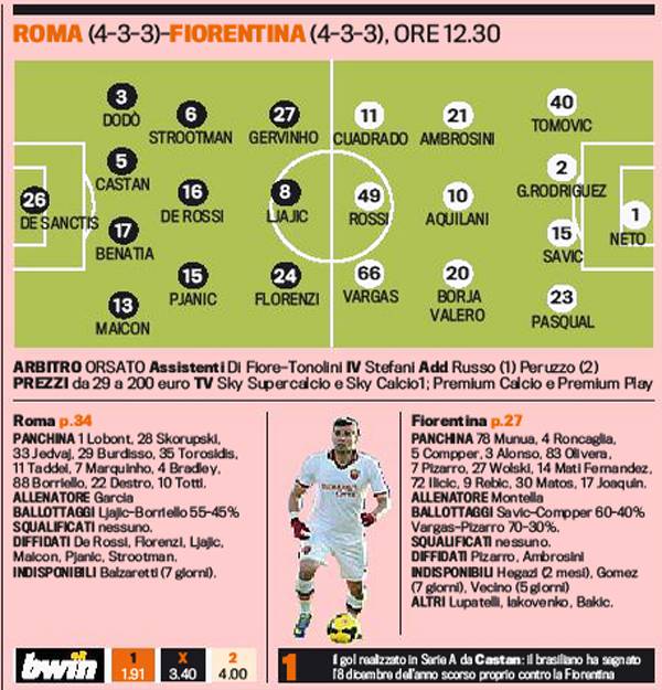 ROMA FIORENTINA PROBABILI FORMAZIONI – Alle 12.30, allo stadio Olimpico, il grande calcio propone la sfida tra Roma e Fiorentina, valida per la 15a giornata di serie A. I giallorossi, dopo quattro pareggi consecutivi, vogliono tornare alla vittoria e per farlo sperano di poter contare sul ritorno di Francesco Totti che sarà presente in panchina ma difficilmente scenderà in campo dal primo minuto. L’unico dubbio per Rudi Garcia riguarda l’attacco dove sono ancora in ballottaggio Marco Borriello e Adem Ljajic. Garcia, tuttavia, dovrebbe schierare la Roma con il solito 4-3-3 con De Sanctis tra i pali, Maicon, Castan, Benatia e Dodò in difesa. Strootman, De Rossi e Pjanic a centrocampo. Florenzi, Ljajic e Gervinho in attacco. Vincenzo Montella, invece, deve rinunciare ancora a Mario Gomez e schiererà la Fiorentina con il 4-3-3 con Neto in porta, Tomovic, Rodríguez, Savic e Pasqual in difesa. Ambrosini, Aquilani e Borja Valero a centrocampo. Vargas, Rossi e Cuadrado in attacco.