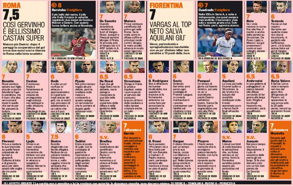 ROMA FIORENTINA VOTI PAGELLE GAZZETTA GERVINHO DESTRO CUADRADO – La Roma vince due a uno contro la Fiorentina e continua la sua corsa alla Juventus. I giallorossi hanno vinto un big match importante contro la Fiorentina dell’ex Montella. Primo tempo che vede i giallorossi in vantaggio con Maicon, ottima partita del brasiliano. Il pareggio è di Vargas che gela l’Olimpico. Il calcio però è pieno di emozioni e nel secondo tempo Garcia manda in campo Destro che dopo qualche minuto segna il gol del due a uno decisivo. Migliore in campo dell’incontro è Gervinho, autentico mattatore del match. Nella Fiorentina bella prestazione di Cuadrado. Voti e pagelle della Gazzetta dello Sport.