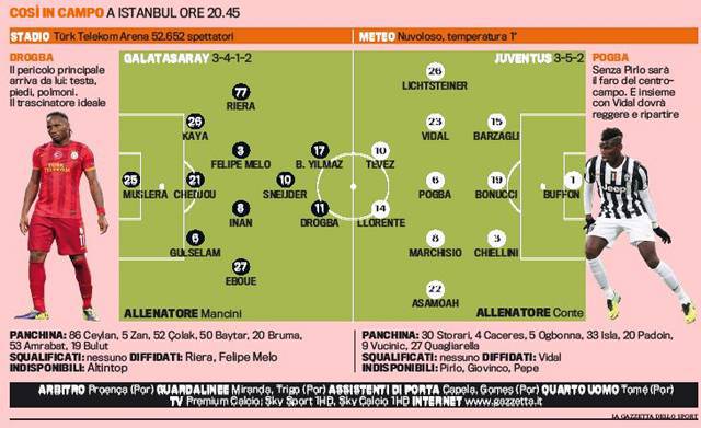 GALATASARAY JUVENTUS PROBABILI FORMAZIONI LLORENTE TEVEZ DROGBA SNEIJDER FOTO – La Juventus giocherà questa sera a Istanbul e cercherà di uscire indenne dallo stadio dei turchi. I bianconeri giocheranno con il 3-5-2 con Pogba nel ruolo di Pirlo, mentre in attacco spazio alla coppia Llorente-Tevez. In difesa ritorna Bonucci centrale con Chiellini e Barzagli ai lati. Molta attenzione per l’attacco del Galatasaray che presenta l’ex Inter Sneijder trequartista dietro la coppia d’attacco formata da Drogba e Ylmaz, un duo pericolosissimo. La Juventus però può contare su due risultati su tre, Conte vuole vincere. Ecco le probabili formazioni secondo la Gazzetta dello Sport.