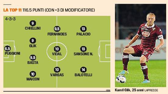 SERIE A TOP 11 15ESIMA GIORNATA GLIK PALACIO – La 15esima giornata di campionato è andata negli archivi, le squadre si ritroveranno sabato per la 15esima giornata. E’ stata una giornata di campionato assolutamente importante che ha visto protagonisti inattesi per certi versi. La top 11 della 15esima giornata ha stabilito un punteggio importante di 116,5 punti con 3 punti di modificatore della difesa. In porta c’è Puggioni, con Glik e Basta centrali, Maicon e Chiellini ai lati. Centrocampo a tre con Vidal centrale, Vargas e Bruno Fernandes ai lati, in attacco Sansone del Parma centrale con Palacio e Balotelli. Ecco la foto della Gazzetta dello Sport.