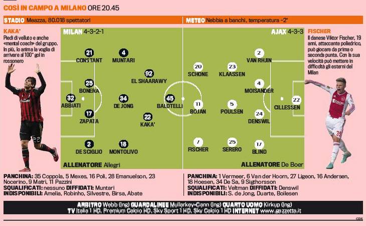 MILAN AJAX PROBABILI FORMAZIONI DE JONG BOJAN – Questa sera il Milan sarà impegnato in un match importantissimo per gli ottavi di finale di Champions League. I rossoneri dovranno e cercheranno di pareggiare o vincere il match contro l’Ajax per volare agli ottavi. Allegri schiera un centrocampo molto muscolare con De Jong centrale, Muntari a sinistra e Montolivo a destra. In attacco rientrerà dal primo minuto Stephan El Shaarawy che affiancherà Kakà e Balotelli in attacco. Contro ci sarà una squadra molto motivata e in un buon momento di forma. In attacco spazio all’ex giocatore rossonero Bojan. Le formazioni della Gazzetta dello Sport.