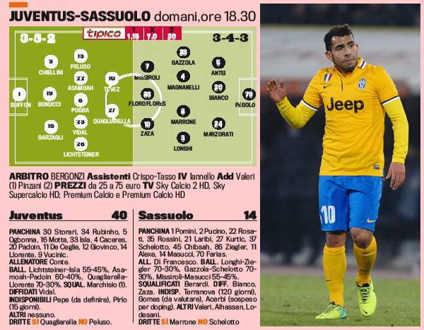 FOTO JUVENTUS SASSUOLO ASAMOAH – Gara di grande importanza quella di domenica pomeriggio per la Juventus. Dopo la negativa trasferta di Istanbul che ha portato fuori dalle coppe europee la squadra allenata da Antonio Conte, è tempo di dedicarsi nuovamente al campionato con la gara contro il Sassuolo di Eusebio Di Francesco, squadra ostica che, ad eccezione della disfatta casalinga contro l’Inter, esprime un buon calcio. La squalifica di Claudio Marchisio impone un sacrificio, o per meglio dire un ritorno alle origini di Kwadwo Asamoah che si rivede nel suo ruolo naturale di interno di centrocampo. Spazio a Quagliarella in avanti con Tevez. In casa Sassuolo, viste le assenze di Berardi ed Acerbi, quest’ultimo squalificato per una positività al doping tutta da chiarire, in campo Missiroli e Bianco dal primo minuto.