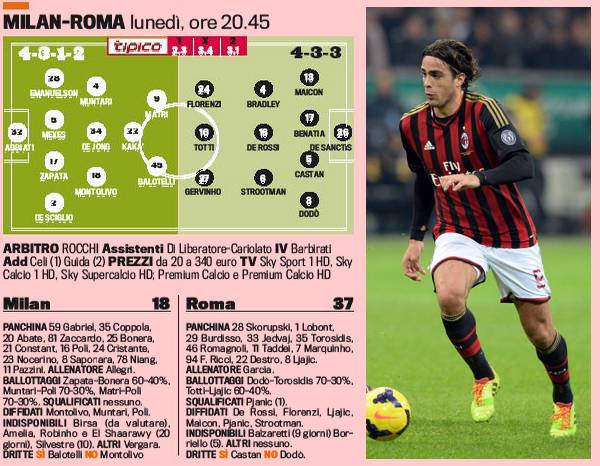 MILAN ROMA PROBABILI FORMAZIONI ALLEGRI GARCIA – Lunedì sera terminerà il 16esimo turno di campionato con il grande match di San Siro tra Milan e Roma. I rossoneri potrebbero lasciare spazio al modulo 4-3-1-2 con Matri e Balotelli in attacco con Kakà dietro le due punte. Attenzione però alla tentazione del tecnico del Milan di puntare sul modulo di ancelottiana memoria, ovvero l’Alberto di Natale con Montolivo avanzato sulla linea dei trequartisti con Kakà e Balotelli unica punta. Nella Roma invece mancherà Pjanic per squalifica, al suo posto Bradley, in attacco invece tornerà Francesco Totti, capitano e attaccante della Roma. Ecco le probabili formazioni della Gazzetta dello Sport.