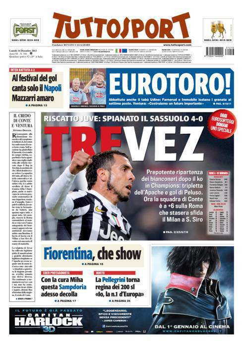 TUTTOSPORT TEVEZ – Quattro a zero della Juventus contro il Sassuolo con tripletta di Tevez. La Juventus riparte dopo il k.o. di Istanbul.