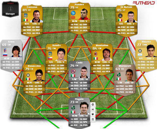 Anche qui troviamo un tridente d’attacco niente male ma c’è Pandev che si è fatto parare il rigore da Handanovic, Di Natale e Cassano che hanno giocato davvero male. A centrocampo l’interista Alvarez e il milanista Montolivo entrambi espulsi, in difesa Ranocchia autore di una prestazione non all’altezza delle sue possibilità.