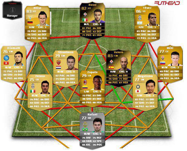 In attacco un tridente da sogno con Klose ritornato al gol, super Tevez con tripletta e il capocannoniere Giuseppe Rossi della Fiorentina. A proposito di Fiorentina, spicca il rientro con gol di Ilicic che ha fatto benissimo. In difesa ci sono tre difensori goleador, Nagatomo, Zapata e Peluso. Ecco la foto della top 11.