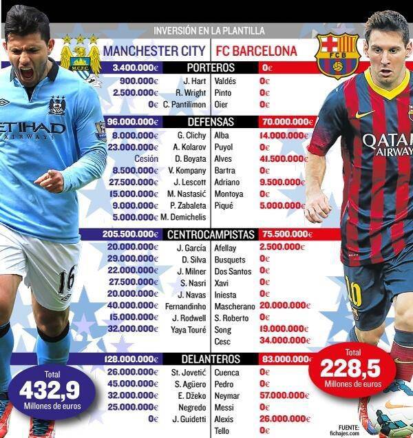 FOTO MANCHESTER CITY BARCELLONA 200 MILIONI – Il sorteggio per gli ottavi di finale di Champions League, ha deciso che ad affrontarsi nel prossimo turno della massima competizione europea saranno Manchester City e Barcellona, due delle squadre senza dubbio più importanti del panorama europeo. C’è però una differenza sostanziale tra le due società: il Barça punta moltissimo su quella che è la propria cantera, il Manchester City sul potere economico dei proprietari. E’ evidente, e questa grafica lo dimostra, come le strategie delle due società siano davvero agli antipodi: 432 milioni spesi dal City, contro i 228 milioni spesi dal Barça.