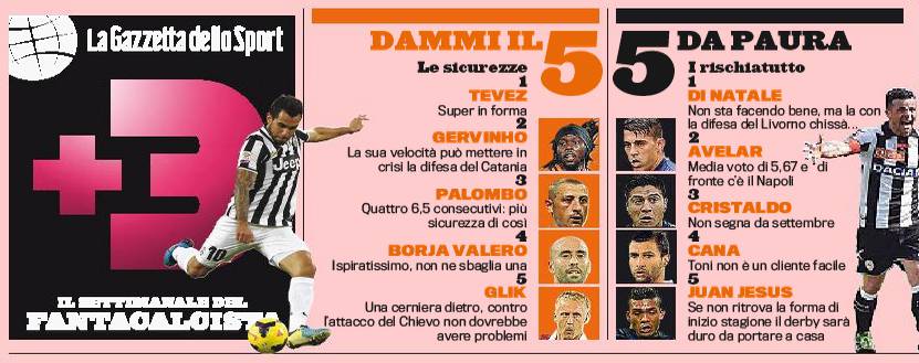 FANTACALCIO CONSIGLI 17^ GIORNATA 5 DA SCHIERARE 5 DA RISCHIARE – Ultima giornata dell’anno solare 2013 della Serie A e, conseguentemente, ultima giornata del 2013 per il fantacalcio. Sotto Natale è giusto regalarsi un regalo, magari anche grazie al fantacalcio. Ecco così i consigli della Gazzetta dello Sport per non sbagliare e per collezionare quanti più punti possibili. Si parte con quelle che sono le sicurezze: Tevez a Bergamo, Gervinho contro il Catania, Palombo contro il Parma, Borja Valero contro il Sassuolo e Glik contro il Chievo. Volete però scommettere tutto? Ecco su chi si può rischiare: Di Natale a Livorno, Avelar contro il Napoli, Cristaldo contro il Genoa, Cana a Verona contro l’Hellas e Juan Jesus nel erby.