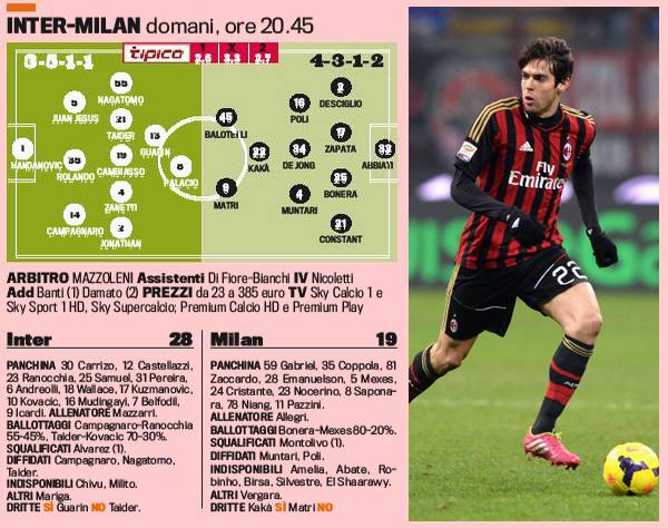 FOTO INTER MILAN PROBABILI FORMAZIONI BALOTELLI KAKA’ MATRI GUARIN PALACIO – Derby delicatissimo per Inter e Milan domani sera a San Siro. Archiviate le discussioni sulle curve, riaperte regolarmente, si può finalmente tornare a parlare di calcio giocato. 28 punti per l’Inter e 19 per il Milan: vincere sarebbe essenziale per entrambe le squadre. Per Walter Mazzarri, al primo derby da tecnico interista, consueto 3-5-2 con la conferma di Rolando in difesa, Zanetti a centrocampo con Taider e Cambiasso, Guarin a servizio di Palacio. Scelte di Allegri invece interessanti con un forte tridente d’attacco composto da Matri, Balotelli e Ricky Kakà.