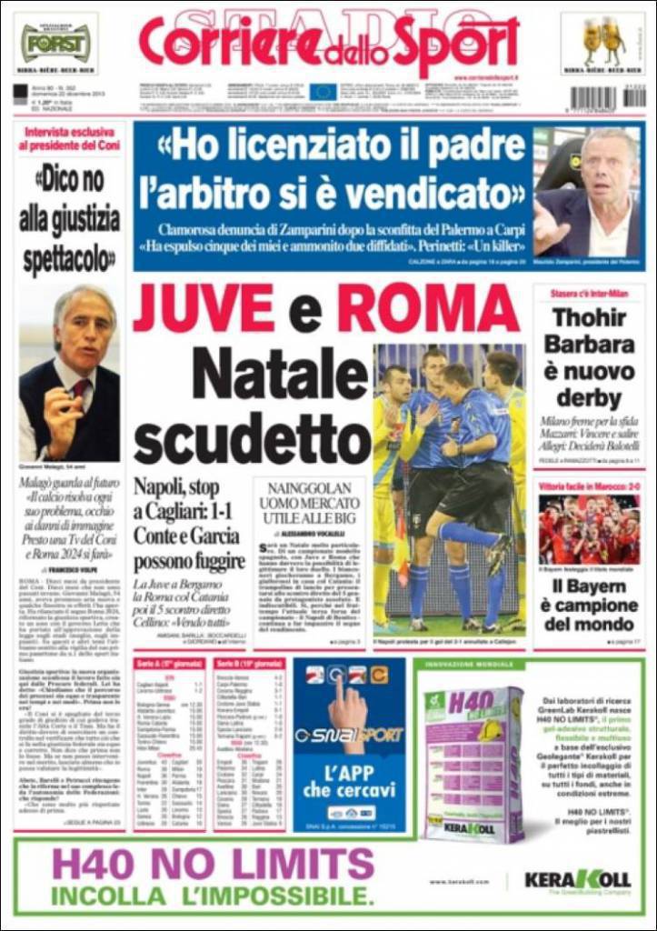 RASSEGNA STAMPA CORRIERE DELLO SPORT – Napoli, stop a Cagliari: 1-1. Conte e Garcia possono fuggire. La Juve a Bergamo, la Roma col Catania. Poi il 5 gennaio scontro diretto. Cellino: “Vendo tutti”. “Ho licenziato il padre, l’arbitro si è vendicato”. Clamorosa denuncia di Zamparini dopo la sconfitta del Palermo a Carpi. “Ha espulso cinque dei miei e ammonito due diffidati”. Thohir-Barbara: ecco il nuovo derby. Il Bayern Monaco è campione del mondo.