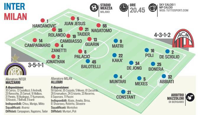 INTER MILAN LE PROBBILI FORMAZIONI – Il 2013 calcistico si chiuderà questa sera con il posticipo delle 20.45 tra Inter e Milan, match valido per la 17esima giornata di serie A. Entrambe le formazioni non stanno attraversando un buon momento e chiudere l’anno con una vittoria nel derby sarebbe un risultato utile non solo per la classifica ma soprattutto per il morale. Secondo le formazioni pubblicate da TuttoSport,Walter Mazzarri, al suo primo derby, schiererà la sua Inter con il 3-5-1-1 con Handanovic tra i pali, Campagnaro, Rolando e Juan Jesus in difesa. Jonathan, Zanetti, Cambiasso, Taider e Nagatomo a centrocampo. Guarin a sostegno dell’unica punta che sarà ancora una volta Palacio. Massimiliano Allegri risponde con il 4-3-1-2 con Abbiati in porta. De Sciglio, Bonera, Mexes e Constant in difesa. Poli, De Jong e Muntari a centrocampo. Kakà sulla trequarti a sostegno delle due punte che saranno Matri e Balotelli.