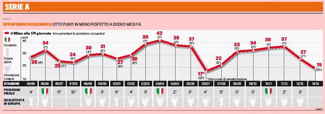 MILAN RUOLINO DI MARCIA CAMPIONATO – Diciamo che Adriano Galliani si aspettava una stagione diversa da parte del suo Milan. Una stagione fatta di risultati positivi, di grandi vittorie e invece per ora l’unica soddisfazione è arrivata dalla Champions League dove i rossoneri sono passati agli ottavi di finale rimanendo di fatto l’unica squadra italiana in corsa. Ma in campionato le cose sono negative. Il Milan ha raccolto solo 19 punti, nelle ultime 9 partite è arrivata una sola vittoria. Mai negli ultimi venti anni c’è stata così penuria di punti raccolti. Un dato allarmante. E anche le reti incassate, 26, sono un dato significativo che fa riflettere molto.