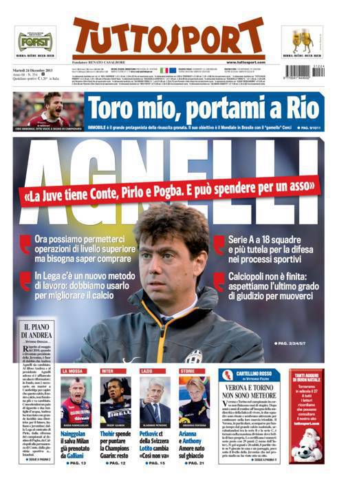 TUTTOSPORT AGNELLI – Il presidente della Juventus Agnelli blinda Conte, Pogba e Pirlo e parla dell’acquisto di un asso.