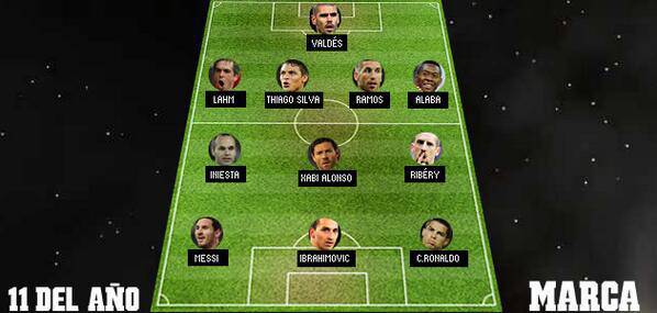 FOTO MARCA TOP 11 ANNO IBRA MESSI RONALDO – Ultimi giorni del 2013, ultimi giorni di valutazioni per un anno straordinario per il calcio. Sono stati 12 mesi davvero intensissimi che hanno visto il Bayern Monaco domandare in lungo ed in largo il calcio mondiale. Sono tanti i calciatori del Bayern presenti nella Top 11 dell’anno stilata dal quotidiano sportivo Marca, insieme alle importanti presenze di Lionel Messi, Zlatan Ibrahimovic e Cristiano Ronaldo. Una formazione spettacolare che, siamo certi, interpreta bene i 12 mesi di calcio pronti a concludersi nelle prossime ore. Come reputate la formazione? Fareste qualche cambio?