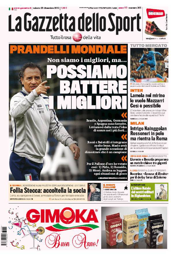 Gazzetta dello Sport: Prandelli “Non siamo i migliori ma possiamo battere i migliori” 28/12/2013 di Admin3 GAZZETTA PRANDELLI – Intervista esclusiva sulla Gazzetta dello Sport da parte del c.t. Cesare Prandelli che parla dei Mondiali. La redazione di Calciomercatonews.com