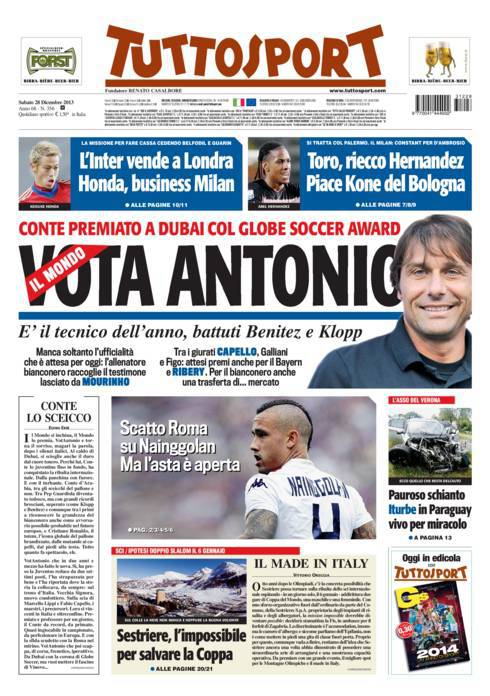 TUTTOSPORT CONTE – Conte riceverà il premio quale miglior tecnico dell’anno a Dubai, ha battuto Klopp e Benitez.