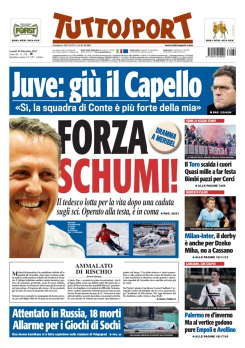TUTTOSPORT SCHUMACHER – Michael Schumacher lotta per la vita dopo la caduta dagli sci. Operato in testa, tutti sperano possa riprendersi.