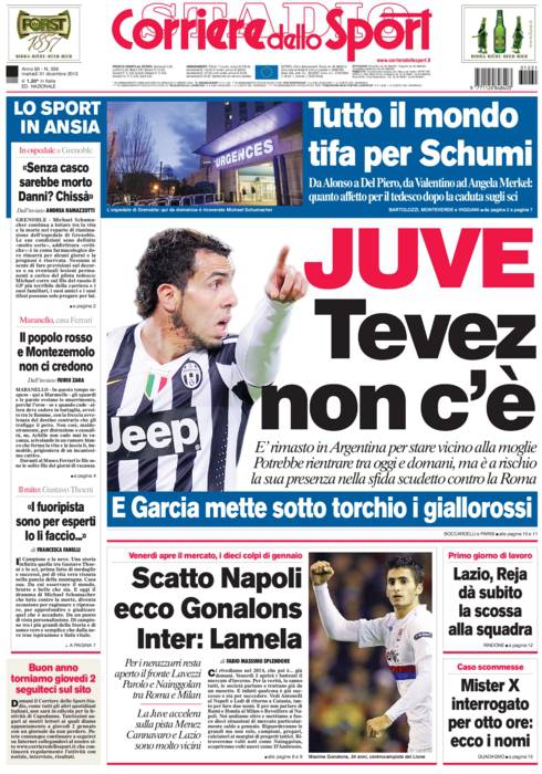 CORRIERE JUVENTUS – Sul Corriere dello Sport si parla di Tevez che non è rientrato dal Sudamerica per stare vicino alla moglie. A rischio il match contro la Roma.