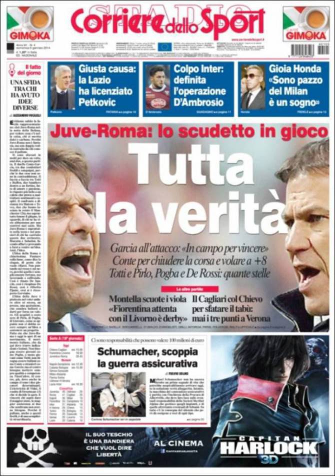 RASSEGNA STAMPA CORRIERE DELLO SPORT . Rudi Garcia all’attacco: “In campo per vincere”, Conte per chiudere la corsa e volare a +8. Totti e Pirlo, Pogba e De Rossi: quante stelle. Giusta causa: la Lazio ha licenziato Petkovic. Colpo Inter: definita l’operazione D’Ambrosio. Gioia Honda: “Sono pazzo del Milan, è un sogno”.