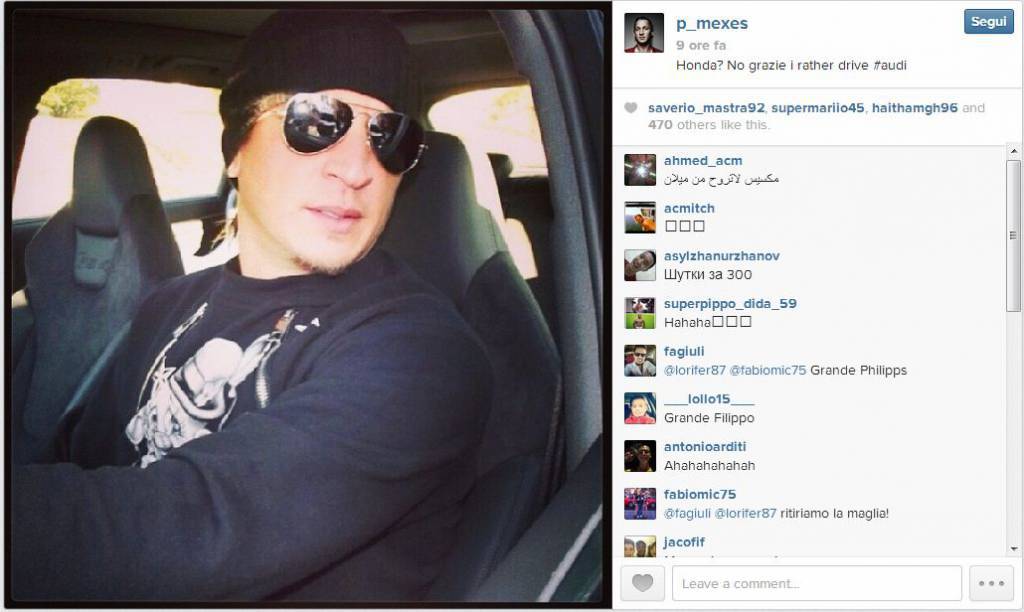 FOTO MEXES INSTAGRAM HONDA AUDI – Messaggio alla società, o una mera battuta di spirito? Viene da chiederselo leggendo l’ultimo post su Instagram di Philippe Mexes, difensore francese del Milan. Il calciatore, commentando un po’ le voci sull’arrivo al rossonero di Keisuke Honda, ha così postato una foto alla guida: “Honda? No grazie i rather drive #audi”. Volendo un po’ interpretare il commento, si potrebbe pensare ad una possibile frecciatina alla società, in vista di una cessione. Certo è che però Mexes è stato uno dei calciatori più utilizzati nella gestione Allegri, prima dell’ultimo infortunio che lo ha tenuto fuori dai campi. Vedremo lo sviluppo…