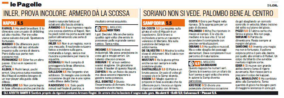 NAPOLI SAMPDORIA VOTI PAGELLE GAZZETTA MERTENS GABBIADINI – Il Napoli vince due a zero contro la Sampdoria e si porta a un punto di distacco dalla Roma che è al secondo posto in classifica. I partenopei vincono grazie alla doppietta di Mertens, talento belga che ringrazia prima Higuain e poi si inventa un calcio di punizione importante che piazza in rete con la complicità del portiere della Sampdoria. Nel Napoli ottima prova di Armero subentrato nel secondo tempo a Reveillere. Nella Sampdoria grande prova di Gabbiadini, giocatore di talento, che ha fatto cose importanti. Voti e pagelle della Gazzetta dello Sport.