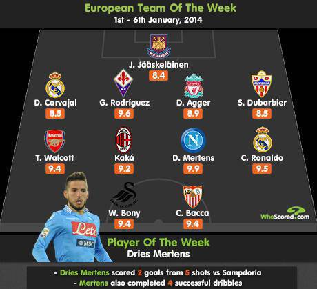 FOTO TOP 11 SETTIMANA EUROPEA ITALIANI – Dopo le settimane di pausa natalizia, è ricominciato anche il campionato di Serie A per la gioia di noi appassionati. Tante belle prestazioni, tanti bei gol, per un weekend che non ha affatto deluso. La redazione di Whoscored.com, noto sito di dati e statistiche sul calcio, ha redatto come ogni settimana la Top 11 dei 5 campionati europei in cui spiccano ben 3 presenze italiane: Dries Mertens, trequartista del Napoli, Ricardo Kakà, trequartista del Milan, e Gonzalo Rodriguez, difensore della Fiorentina, tutti a 3 a segno nella 18^ giornata. Un 4-4-2 davvero ricco di qualità che elegge però a migliore della settimana proprio il belga Mertens con un rendimento di 9.9.