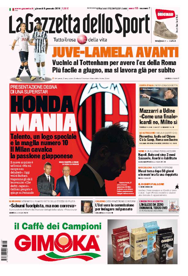 GAZZETTA HONDA – Sulla Gazzetta dello Sport si parla di Honda che ieri è stato presentato dal Milan come una vera star.