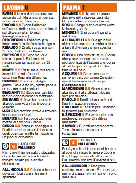 LIVORNO PARMA VOTI PAGELLE – Con Antonio Cassano ancora escluso dall’undici titolare, il Parma di Roberto Donadoni comunque non sbaglia e batte il Livorno per 3-0 grazie alla rete di Palladino e alla doppietta di Amauri. Un risultato importante per i ducali che, invece, spinge gli amaranto verso la zona più bassa della classifica. A decidere il match, però, sono stati gli episodi, sicuramente non favorevoli per la squadra di Nicola. Il gol di Palladino è il frutto di una svista generale. Il Livorno cerca la reazione collezionando anche diverse occasioni che, però, vengono sprecate. Ecco voti e pagelle della Gazzetta dello Sport: