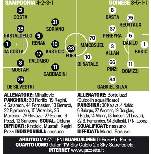 FOTO SAMPDORIA UDINESE PROBABILI FORMAZIONI EDER DI NATALE MAICOSUEL – Questa sera ci sarà anche il posticipo tra Sampdoria e Udinese, due squadre in cerca di riscatto dopo le ultime sconfitte. La Sampdoria di Mihajlovic cercherà di vincere e punterà sul 4-2-3-1 con Eder in attacco e un trio di trequartista dietro con Gabbiadini, Krsticic e Soriano. Nell’Udinese invece ci sarà Di Natale, accanto a lui conferma per Maicosuel, il giustiziere dell’Inter in Coppa Italia. Si tratterà di un match importante per entrambe le squadre. Ecco le probabili formazioni secondo la Gazzetta dello Sport.