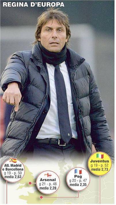 FOTO JUVENTUS EUROPA MEDIA PUNTI – La Juventus chiude il girone d’andata a quota 52 punti in 19 giornate, una media di 2,73 punti a giornata. Media altissima che dimostra come la Juventus stia facendo un campionato assolutamente strepitoso, non a caso sta battendo record su record. Insomma per i bianconeri qualcosa di eccezionale. Anche perché se mettiamo a confronto le altre capoliste dei maggiori campionati, nessuno arriva alla media della Juventus. Barcellona e Atletico Madrid in Spagna hanno 2,63 di media punti, l’Arsenal 2,28 e il Psg di Blanc 2,35. Eppure i bianconeri sono già fuori dalla Champions League. Ecco la foto del Corriere dello Sport.