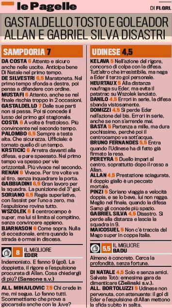 FOTO SAMPDORIA UDINESE PAGALLE EDER DI NATALE – La Sampdoria di Mihajlovic demolisce l’Udinese vincendo tre a zero. La cura Sinisa funziona e la Sampdoria sembra una squadra molto pimpante e in salute. Dall’altra parte invece c’è una squadra, l’Udinese, senza energie fisiche e mentali. Un crollo assurdo quello dei friulani, tutti negativi, si salva solo Badu che prende 5,5. Disastroso Di Natale, un giocatore irriconoscibile, male tutti soprattutto la difesa. Per la Sampdoria migliore in campo Eder, autore di una prestazione fantastica, indemoniato. Voti e pagelle della Gazzetta dello Sport.